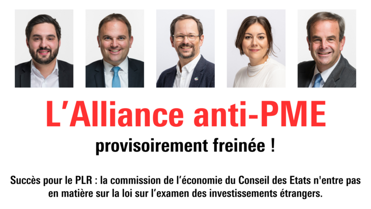 Grâce au PLR, la Commission de l'économie et des redevances du Conseil des Etats (CER-E) a pour l'instant évité le pire en décidant de ne pas entrer en matière sur la dangereuse loi sur l'examen des investissements étrangers qui aurait déclenché une vague bureaucratique pour les PME. Rappelons que cette loi « tueuse d'emplois » avait trouvé une majorité au Conseil national suite à une alliance antilibérale et ce sans tenir compte des coûts pour les PME de notre pays. Ainsi, Cédric Wermuth (co-président du PS), Marcel Dettling (président de l'UDC), Gerhard Pfister (président du Centre), Samira Marti (co-présidente du groupe socialiste) ou Balthasar Glättli (Verts) ont tous voté en faveur de nouvelles mesures bureaucratiques. Ce n'est que grâce à l'opposition du PLR que la nouvelle autorité de contrôle est pour l'instant écartée ce qui représente une lueur d'espoir pour l'économie et les entreprises de notre pays.