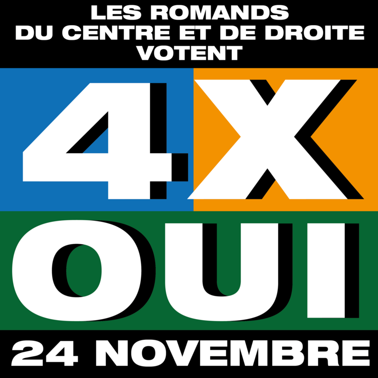 Le comité 4X OUI souhaite rassembler tous les romandes et romands qui se reconnaissent dans les idées du centre et de la droite. Ces quatre projets, soutenus par une large majorité du Parlement, sont des réformes modernes, conçues pour répondre aux défis actuels et futurs de la Suisse.