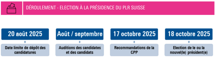 Sur cette base, la CPP soumettra une recommandation de vote à l'Assemblée des délégués le 17 octobre 2025 à Berne. Le lendemain, le 18 octobre, les déléguées et délégués du PLR.Les Libéraux-Radicaux éliront ensuite la nouvelle présidente ou le nouveau président du parti.